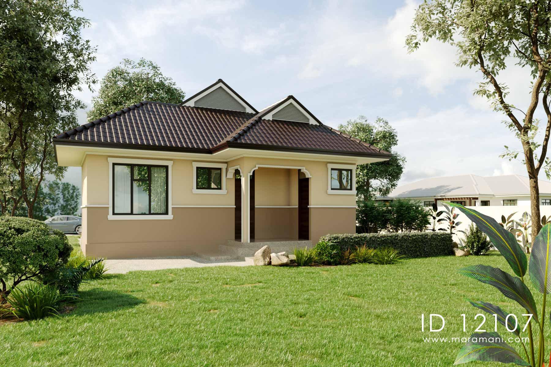 A simple 2 bedroom small house floor plan with a large living room and a semi-open kitchen layout. The plans contains two bedrooms each with in-built closets. Decorative columns, roof and details make this small house a truly beautiful piece of architecture.